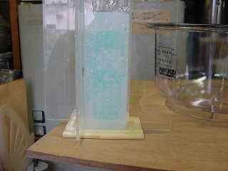 予備脱泡したシリコーンを流し込む。(最初はゆっくり携帯の前後左右に均等流し込む。) |