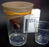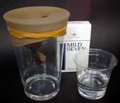 左の写真は・・ (消泡用の濾過) パンストを切って、片方を結び コップにかぶせて、輪ゴムで固定。